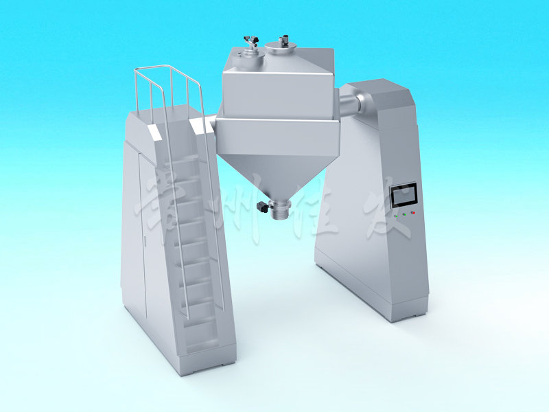 該機通過機械傳動,使不對稱的V型圓柱體內的物料做往復翻動,達到均勻混合之目的。